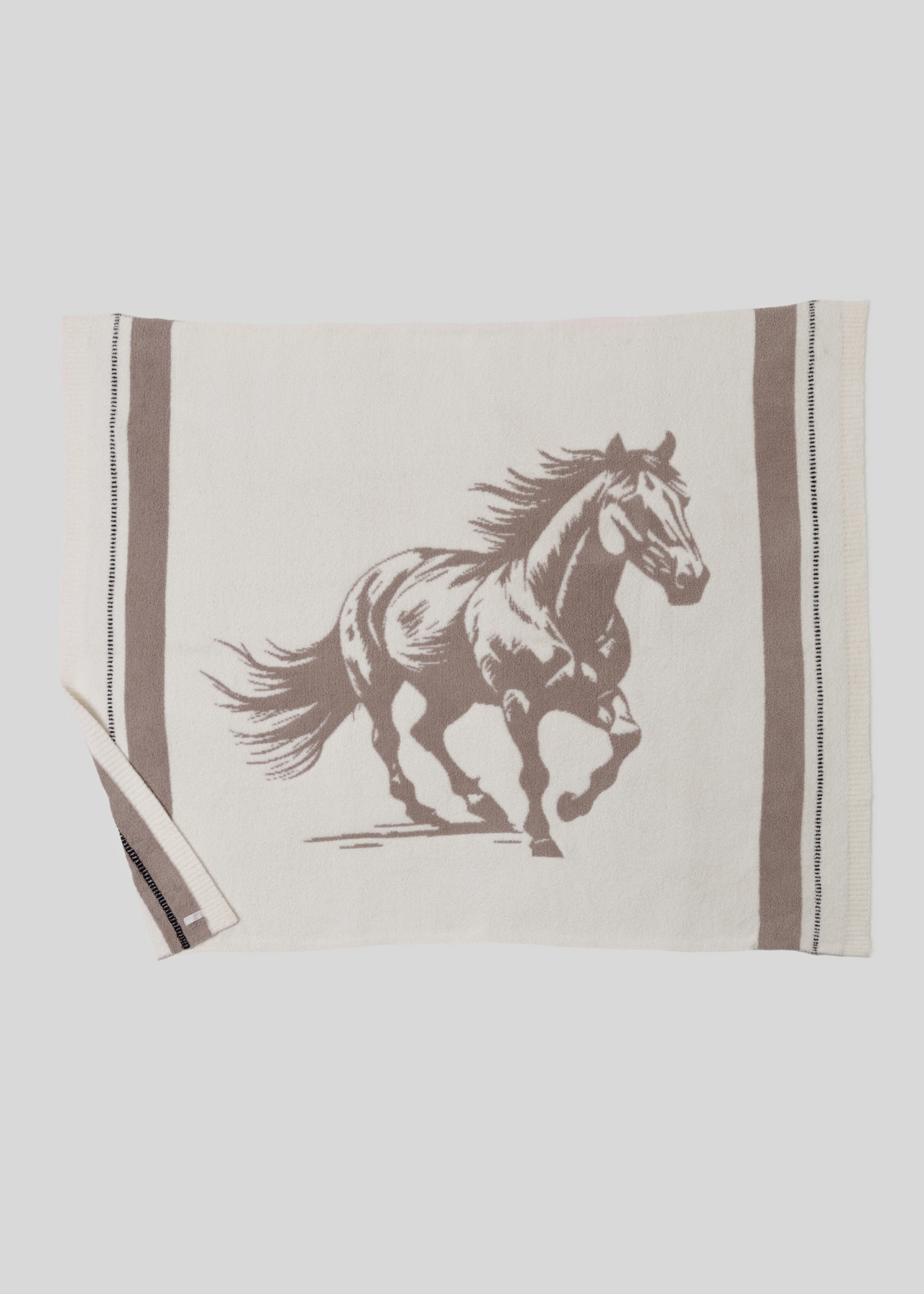 Add a bold yet refined accent to your space with our CozyChic® Stallion Throw, where artistry and comfort meet in stunning silhouette. Knitted in luxurious jacquard, this throw features a striking stallion figure framed by graphic block stripes and subtle dashed line details at both ends. Perfect for equestrian lovers or those seeking a unique statement piece, the throw is finished with ribbed hems and crafted from our famously soft CozyChic® fabric. Measures 54" x 72". Imported.