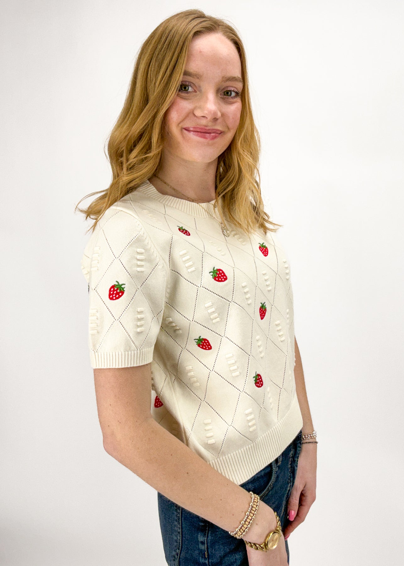 This cozy knit top features a subtle strawberry pattern that is great for spring and summer styling.