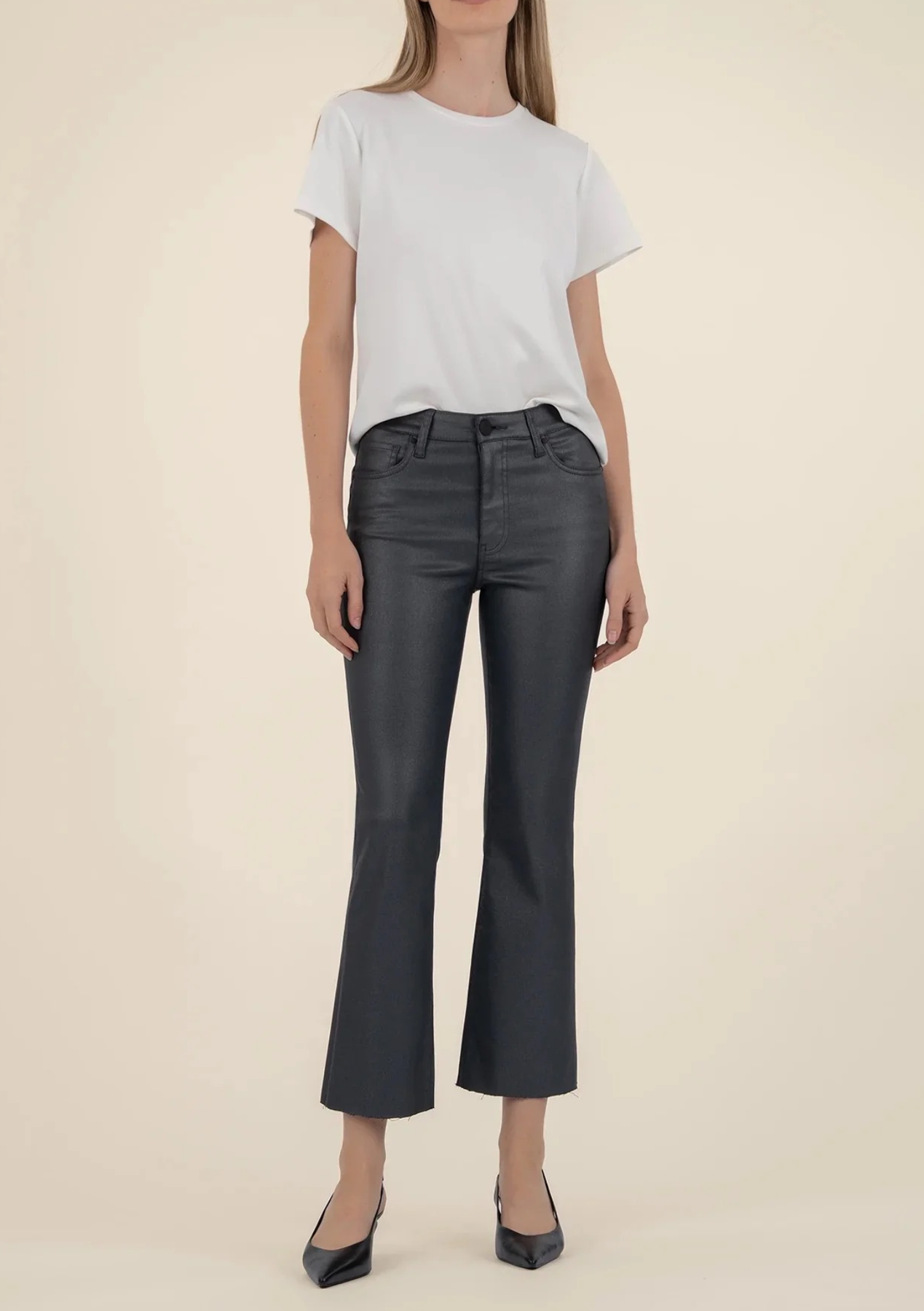 Elevate your denim game with these high-rise ankle flare jeans, designed to flatter your figure while offering a modern twist. Crafted from a sleek coated material, they feature a raw hem for a touch of edge and a chic Silver Bell color that boasts a rich, deep tone. Perfect for dressing up or down, these jeans seamlessly blend bold style with everyday comfort.