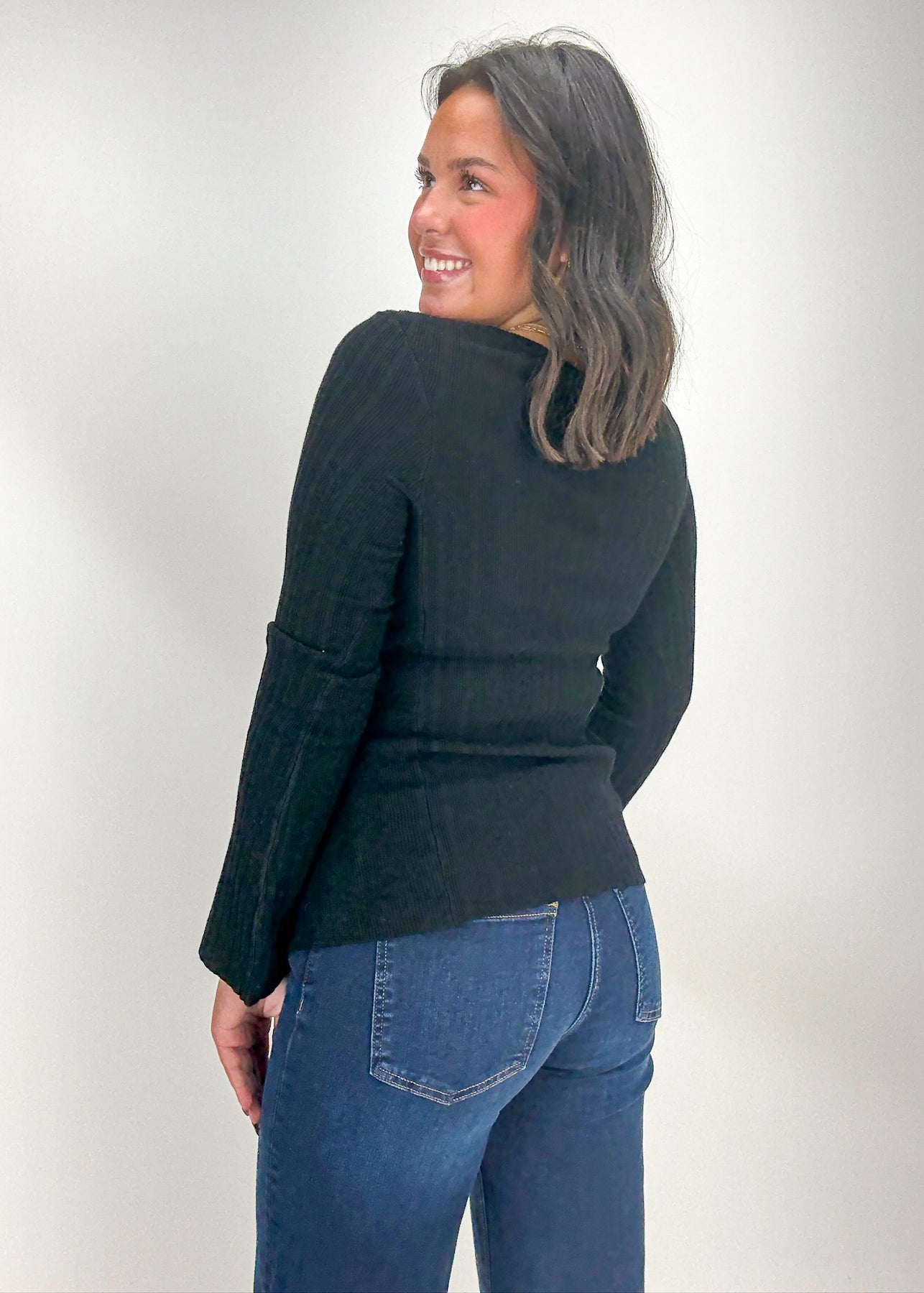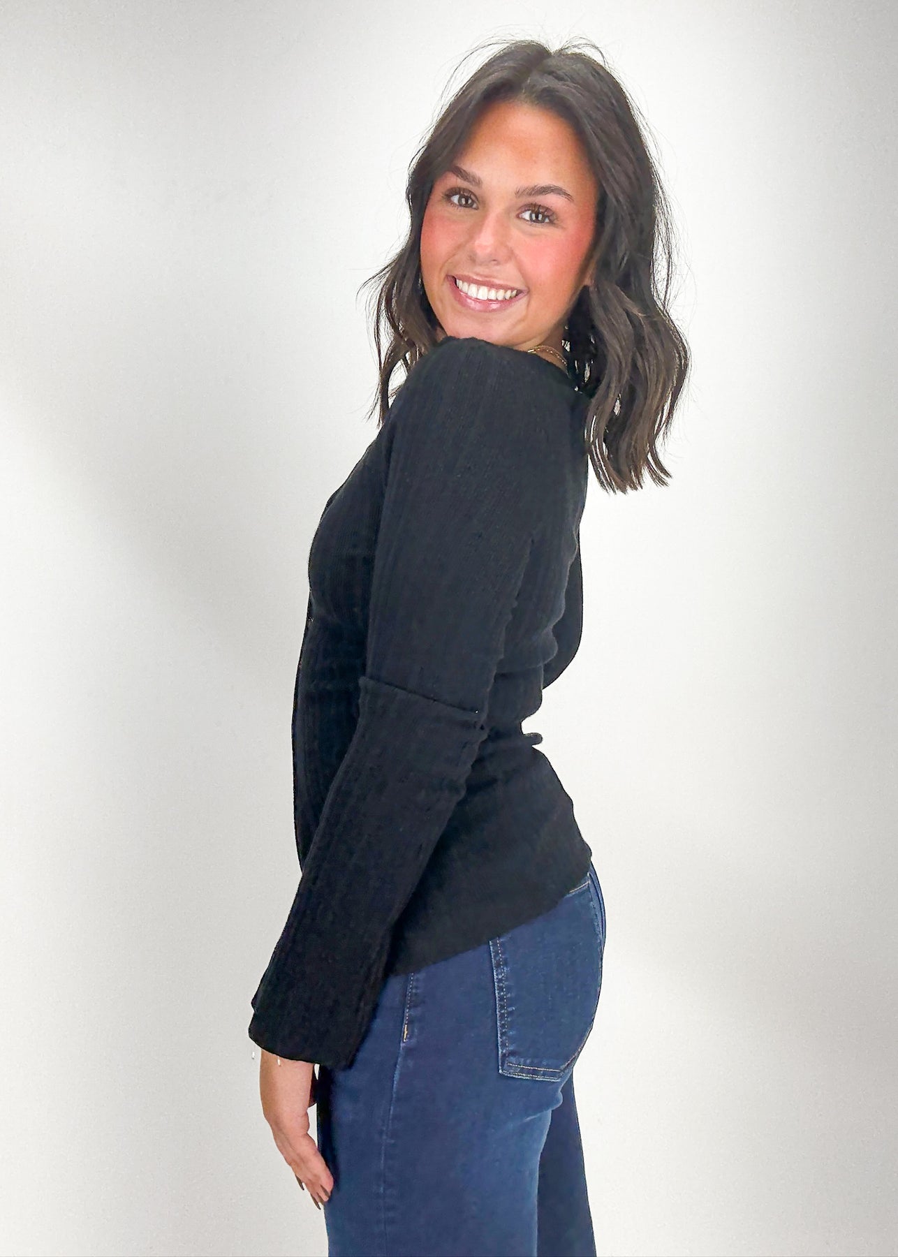 This button up cardi comes in a classic black with white front buttons and is so cozy!