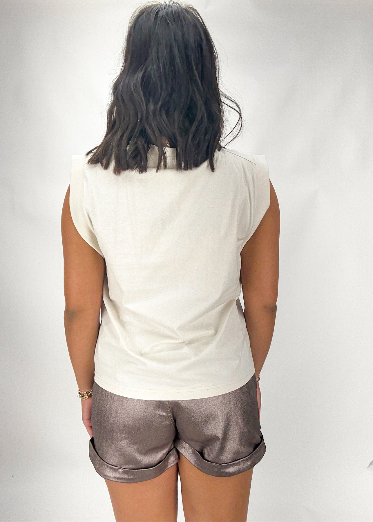 Dress up your holiday look with this "Cheers!" embroidered tee. Perfect for layering under a bold cardigan or jacket, this sleeveless, cream colored tee features gold embroidery for a sophisticated look.