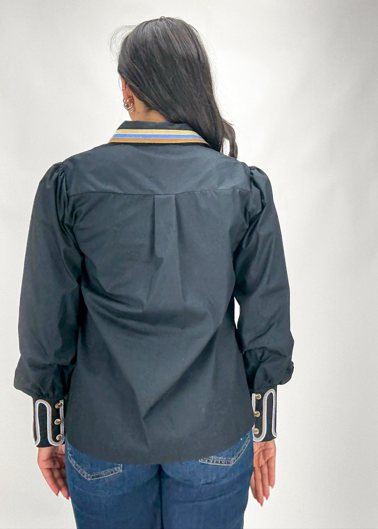 A classic black button down with a fun twist! This button down features a brown and white striped collared neckline, long puff sleeves, and brown patterned sleeve cuffs.
