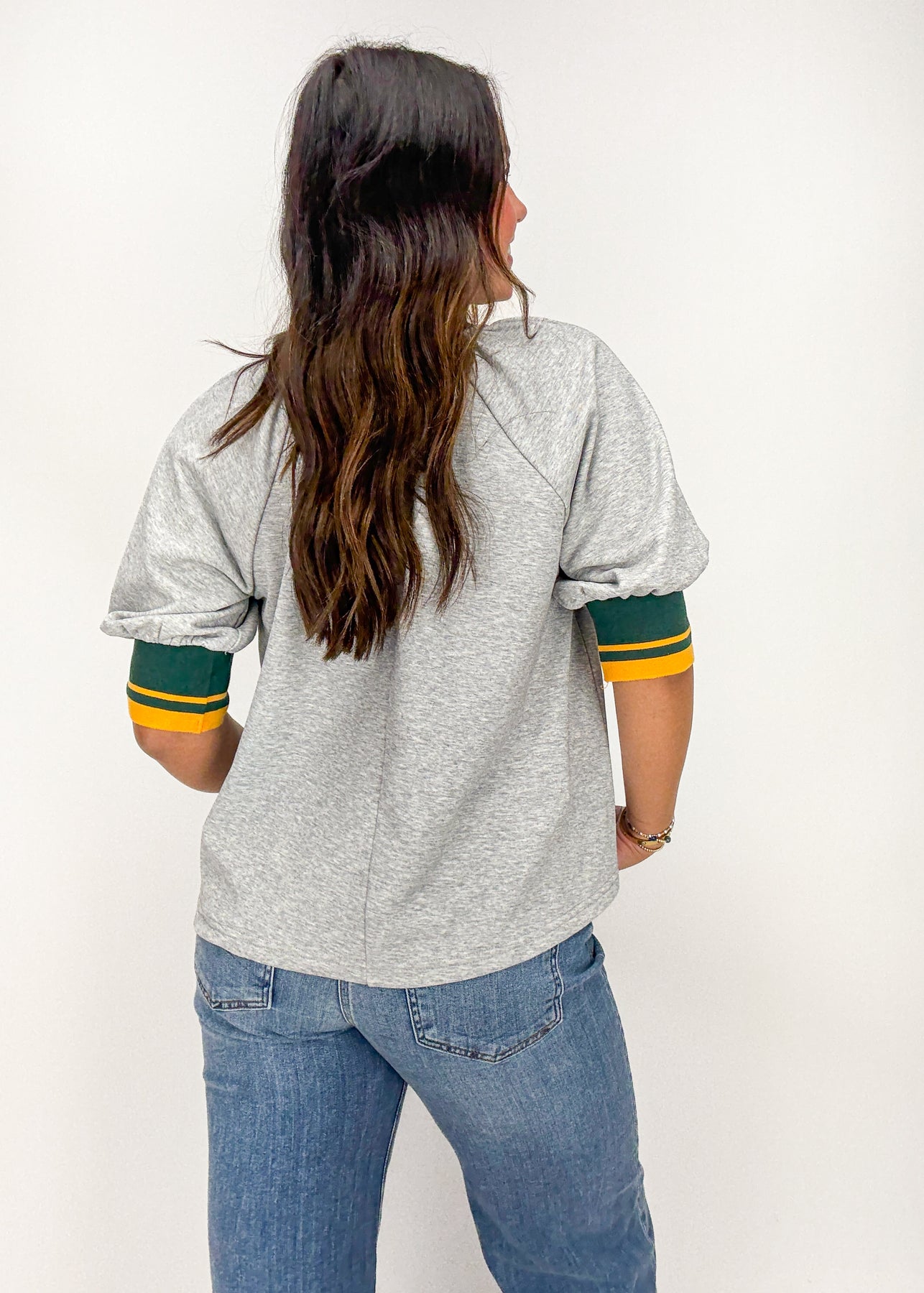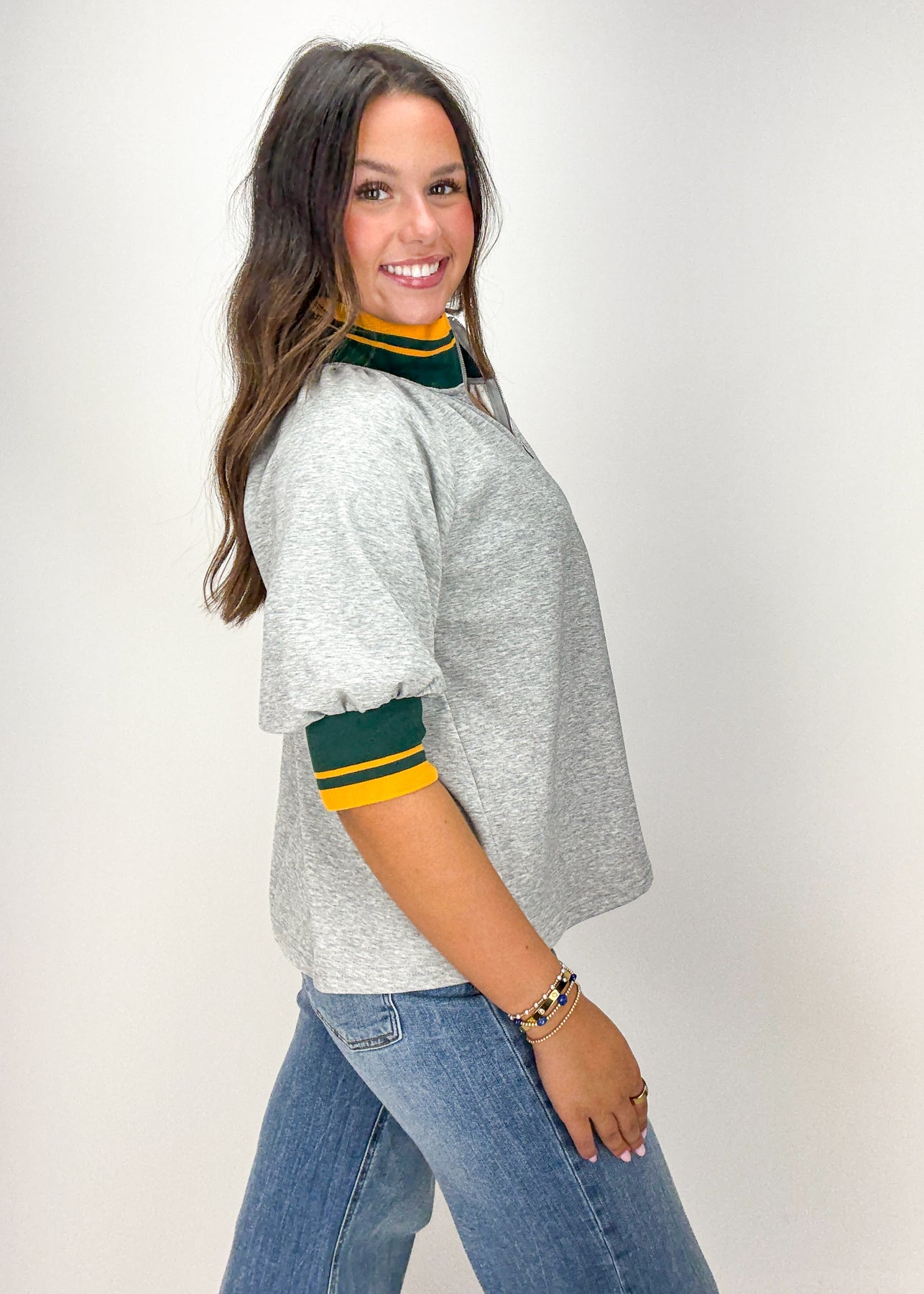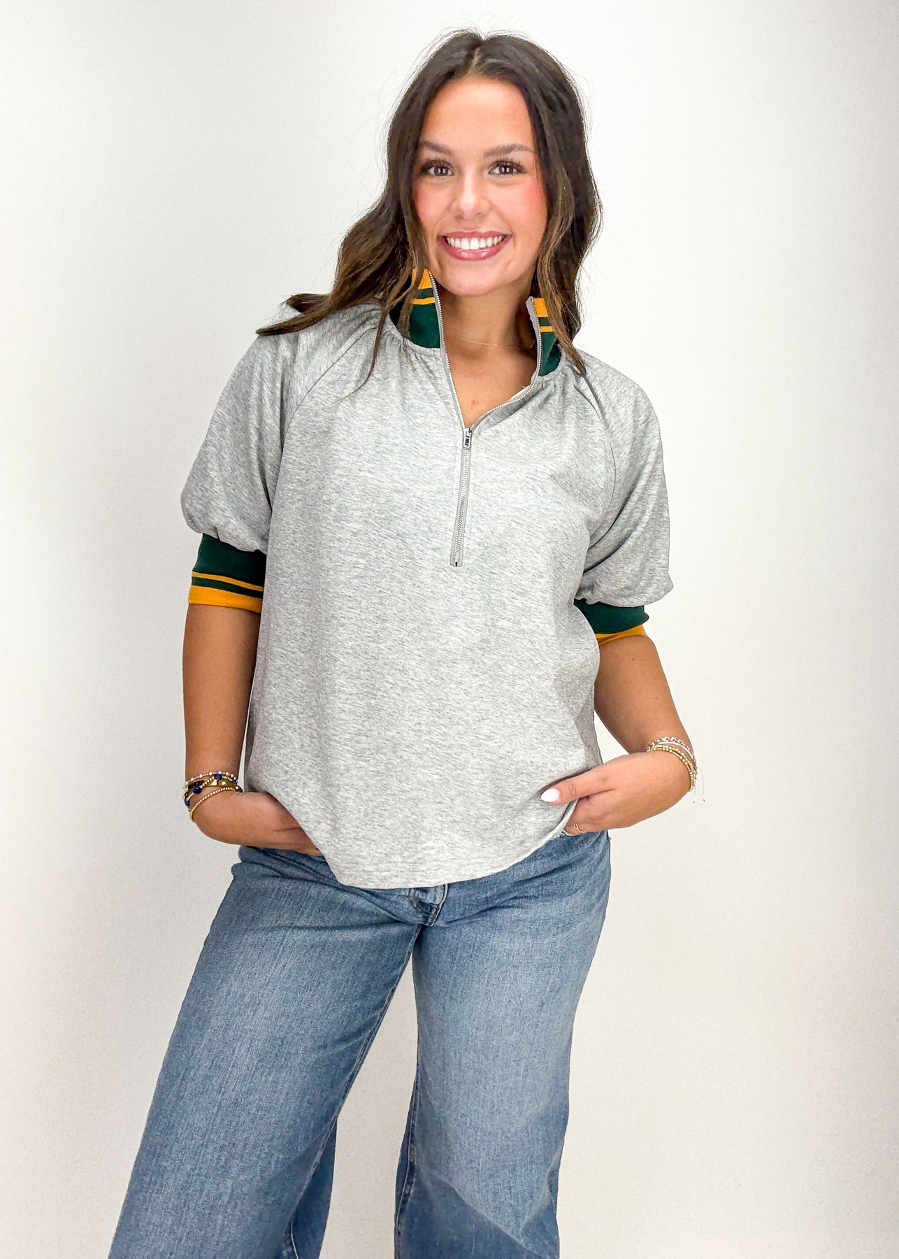 Cozy and classic, this heather grey top features a collared neckline and striped trim detailing.