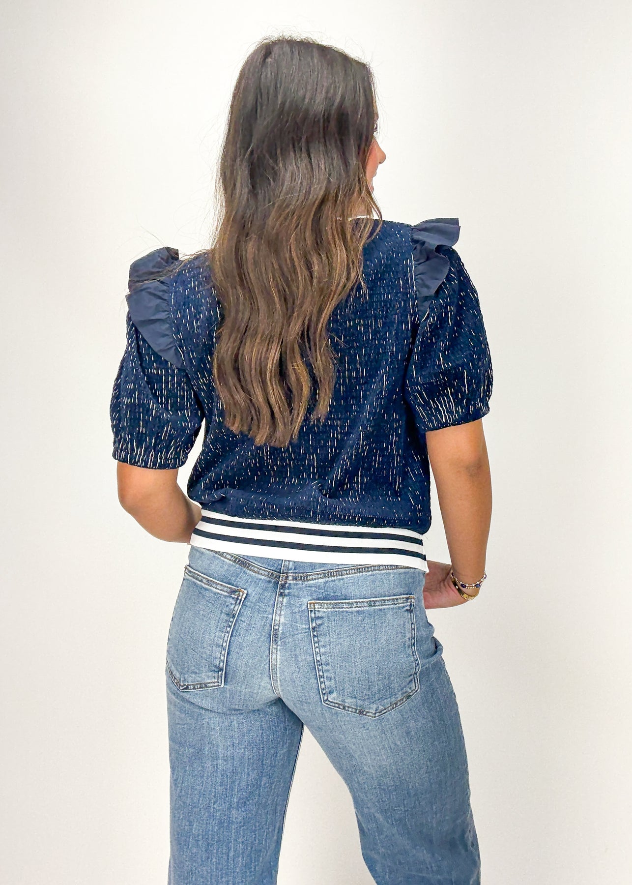 With ruffle sleeves, contrast stripe trim, and an irresistible texture, this top is a must have for your next dressy event.