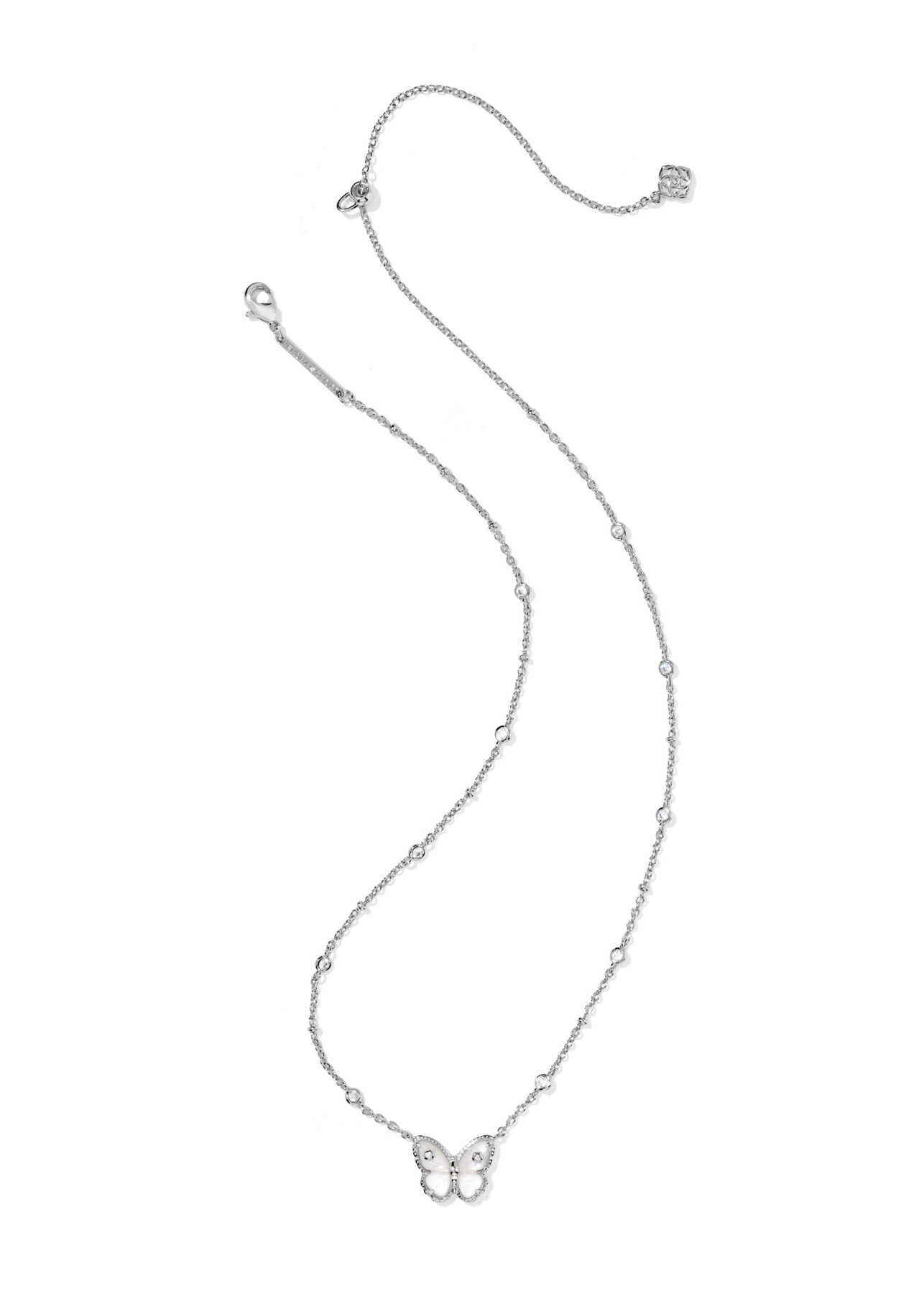 Complete with custom-carved stones to bring this beautiful motif to life, the Cailey Butterfly Rhodium Short Pendant Necklace will be a stunning addition to your collection. Inspired by sunlight streaming through a garden, this reversible necklace features sparkling cubic zirconia accents on a delicate chain. This classic butterfly shape is accented by metallic beauty marks for a fluttery and fabulous look.