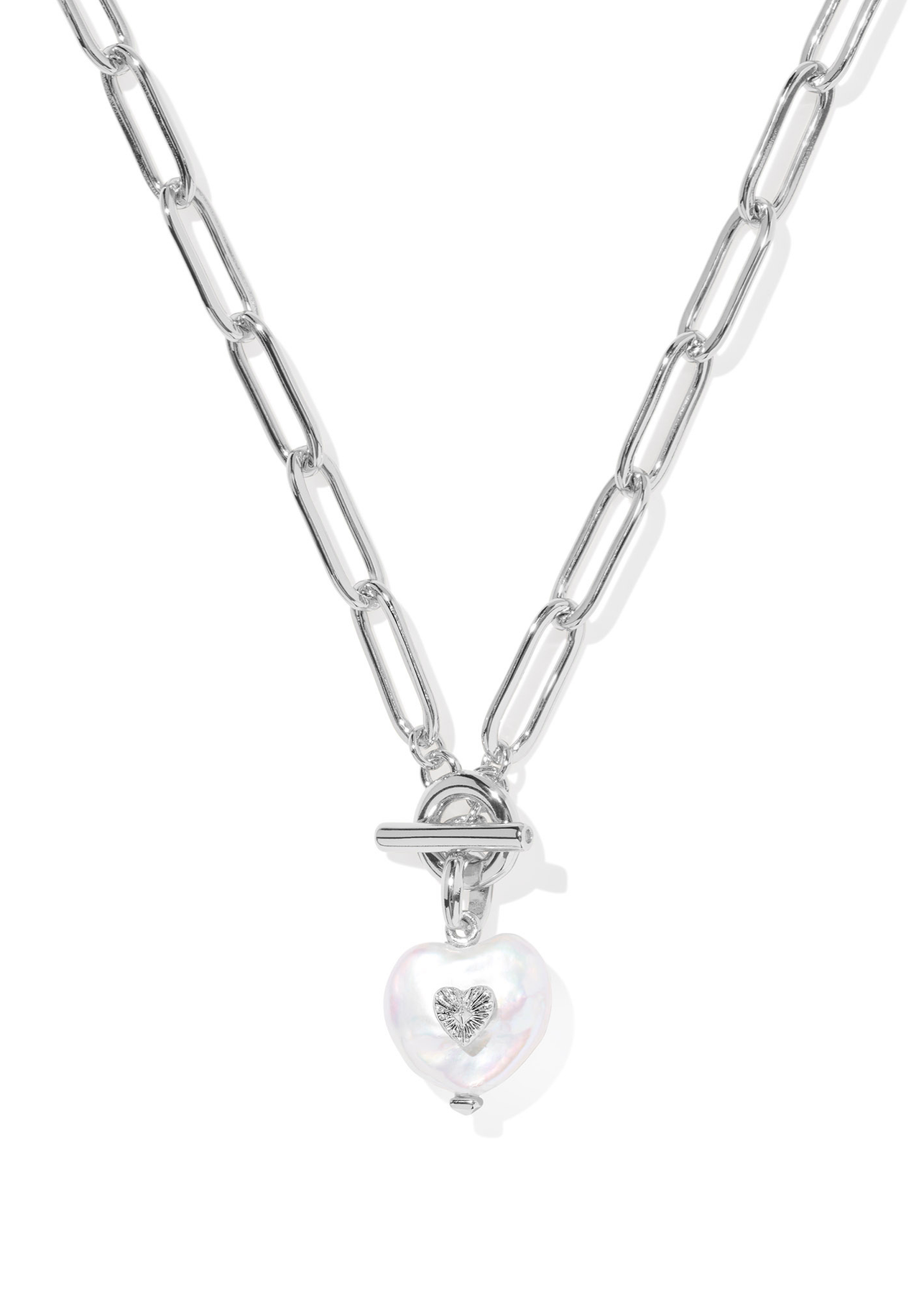 Make a statement this holiday season with this stunning rhodium chain necklace featuring a heart shaped, pearl pendant.