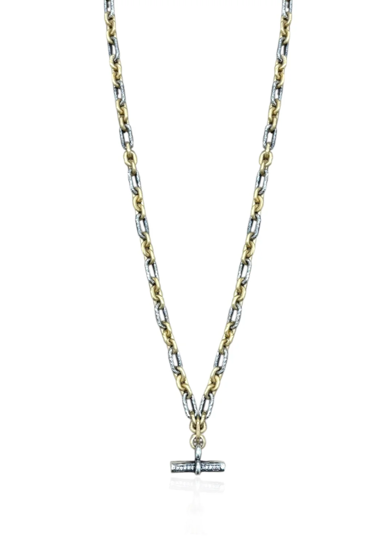 A mixed metal chain necklace with a bold toggle closure with CZ details is the luxurious statement piece your jewelry collection is begging for! Plus, it's great for layering.