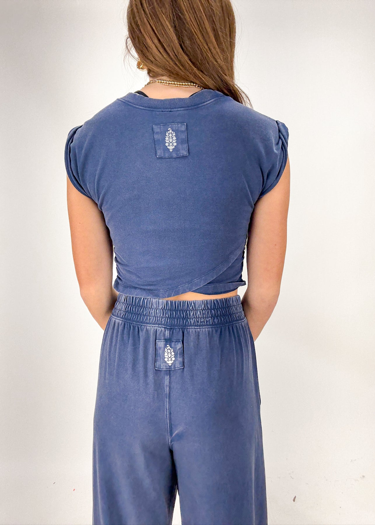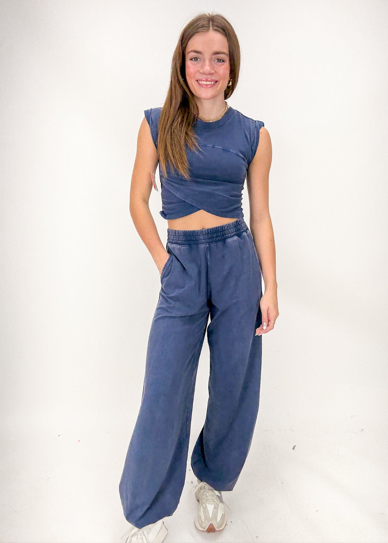 Features: Soft, jersey fabrication; relaxed fit; cropped muscle tee top with seaming detail; ankle length pant with high-rise waist and wide leg; elasticated waistband and cuffs; crossover detail on top; ribbed collar; side seam pockets