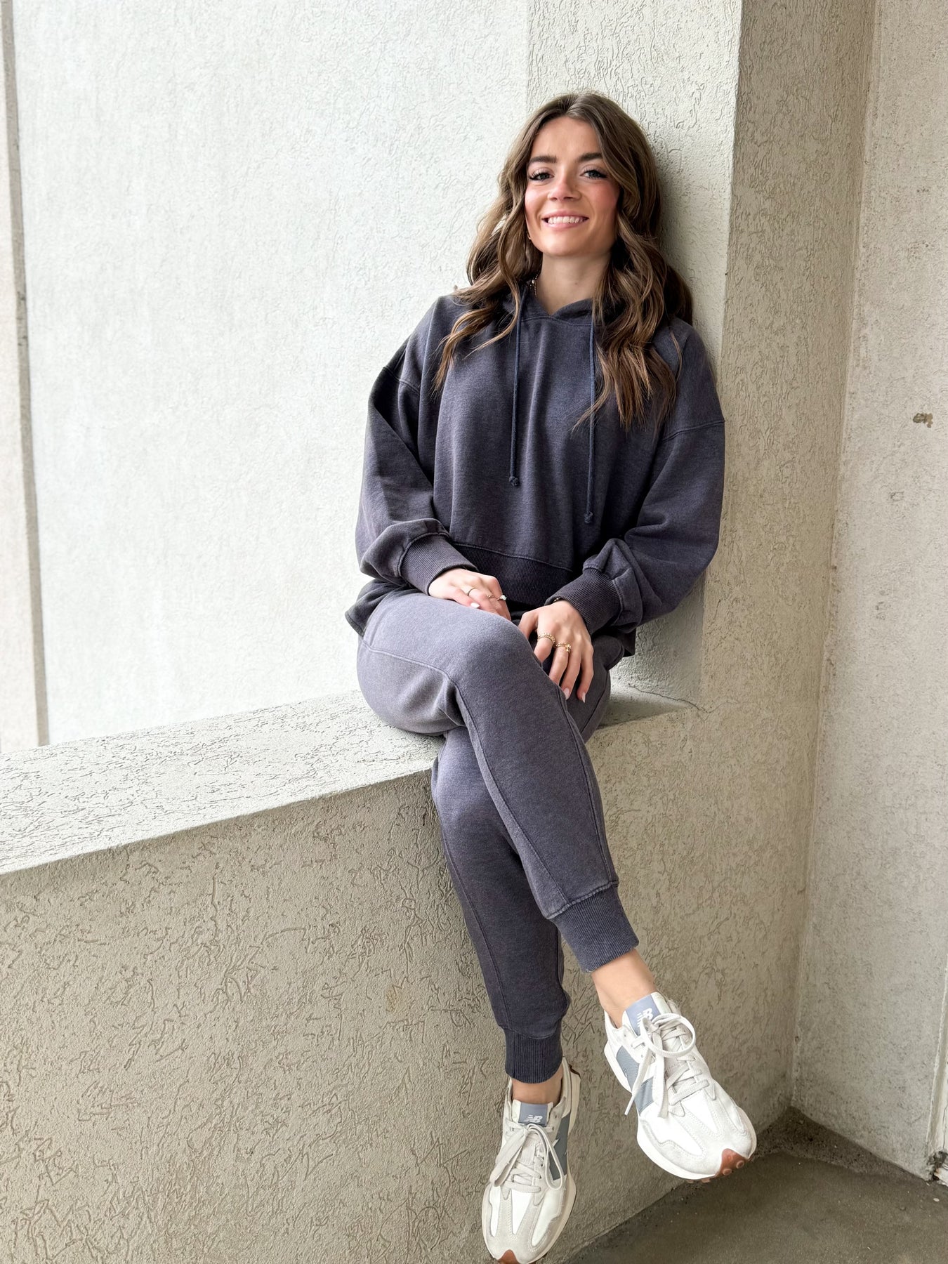 Woman wearing a dark gray sweatshirt and pants on a white background