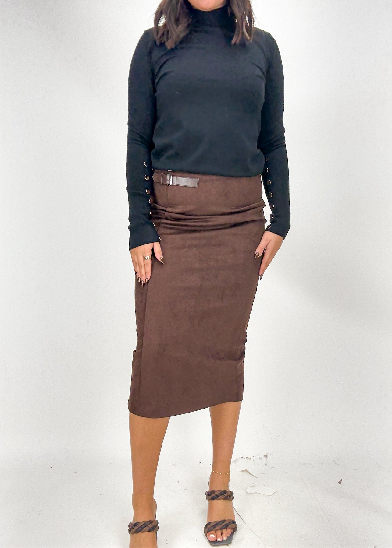 This faux suede maxi skirt takes a bold spin on a classic! In a dark brown hue, this piece includes a double buckle detail on the side that gives it the perfect touch of interest. The fitted style is ideal for styling with a sweater or a chic button down.