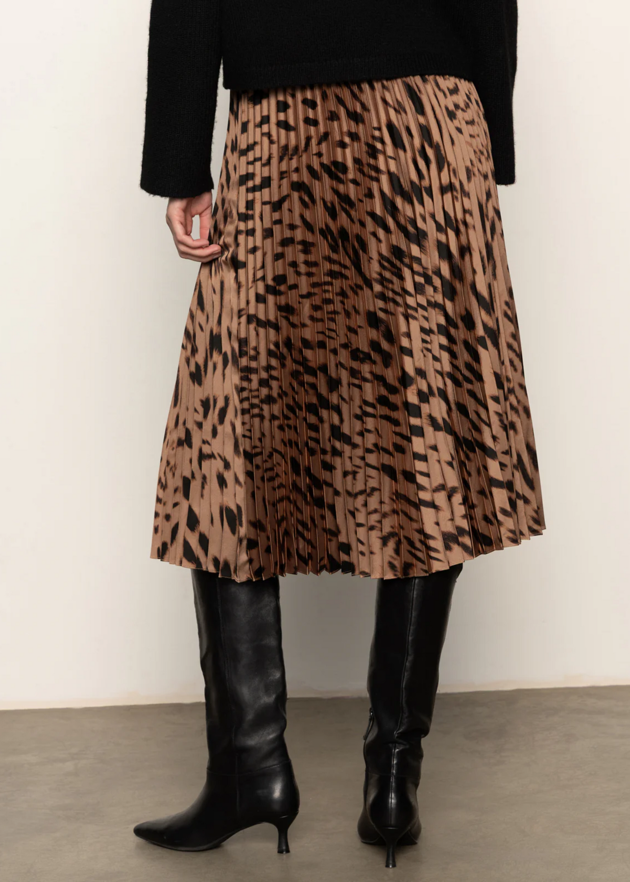 This leopard print midi skirt is the epitome of a subtle statement piece. In a cool brown with all around pleats, this piece is a must have.