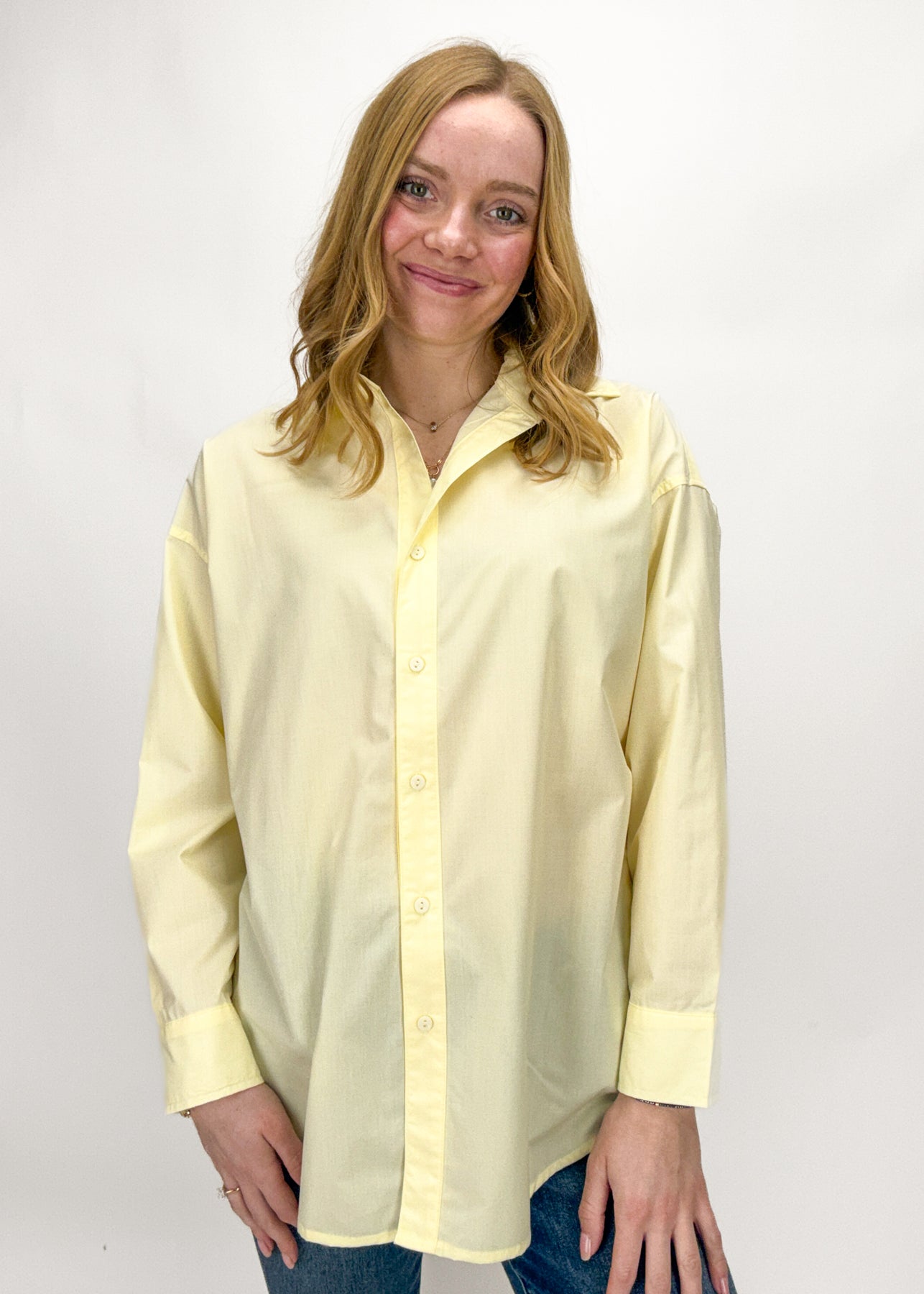 Spring has arrived and this oversized button down is a must have! In a warm butter yellow, this piece is perfect for layering under a sweater vest or styling solo with your favorite pair of jeans.