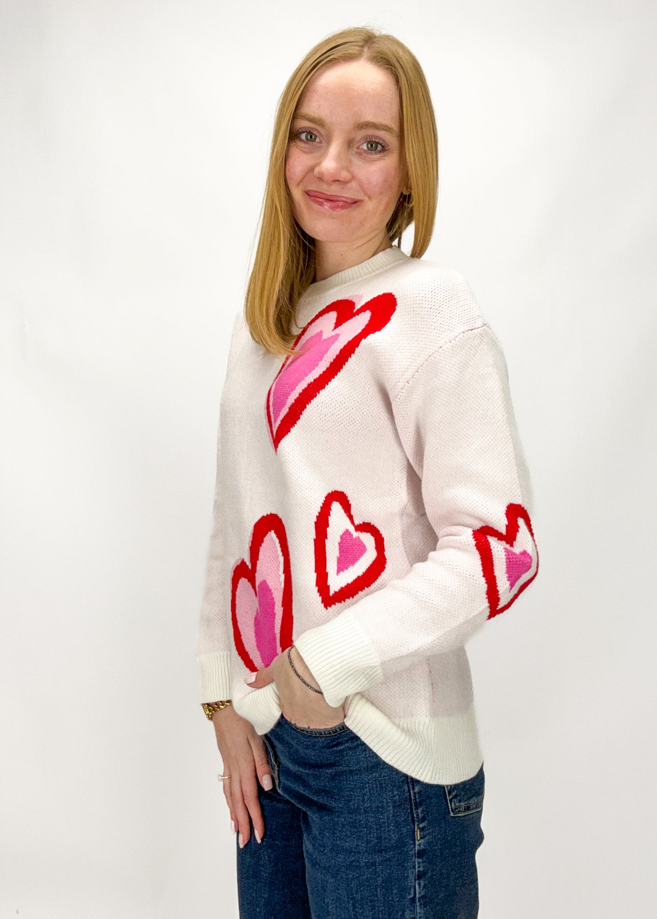 Person wearing a white sweater with red and pink heart patterns on a plain background