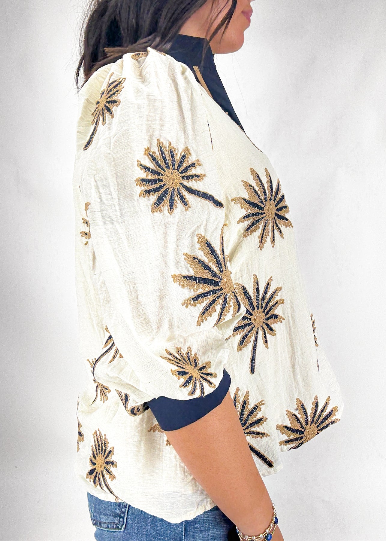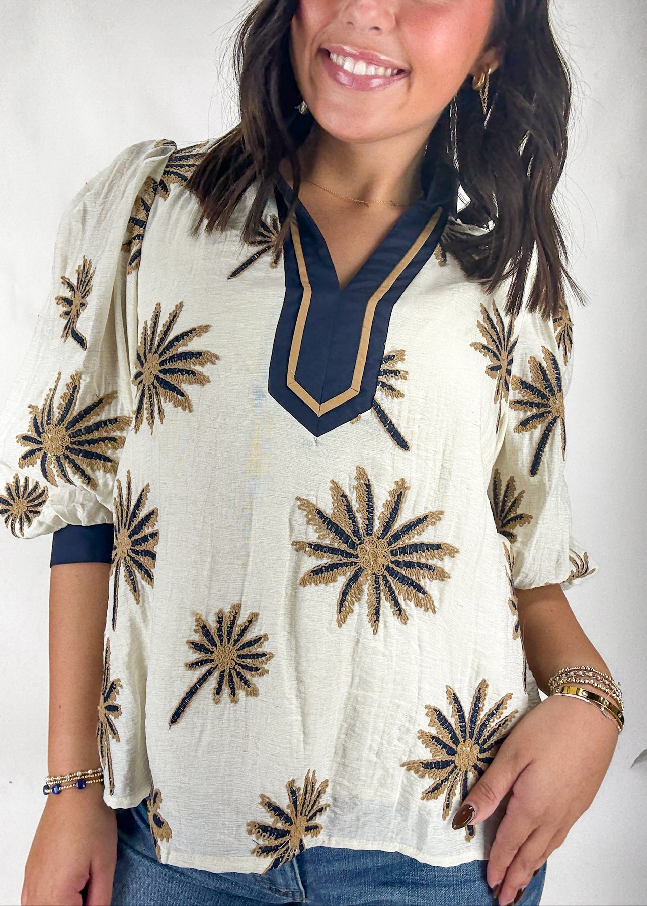This ecru colored top features navy palm tree patterned embroidery, navy trim, and a v-neckline.