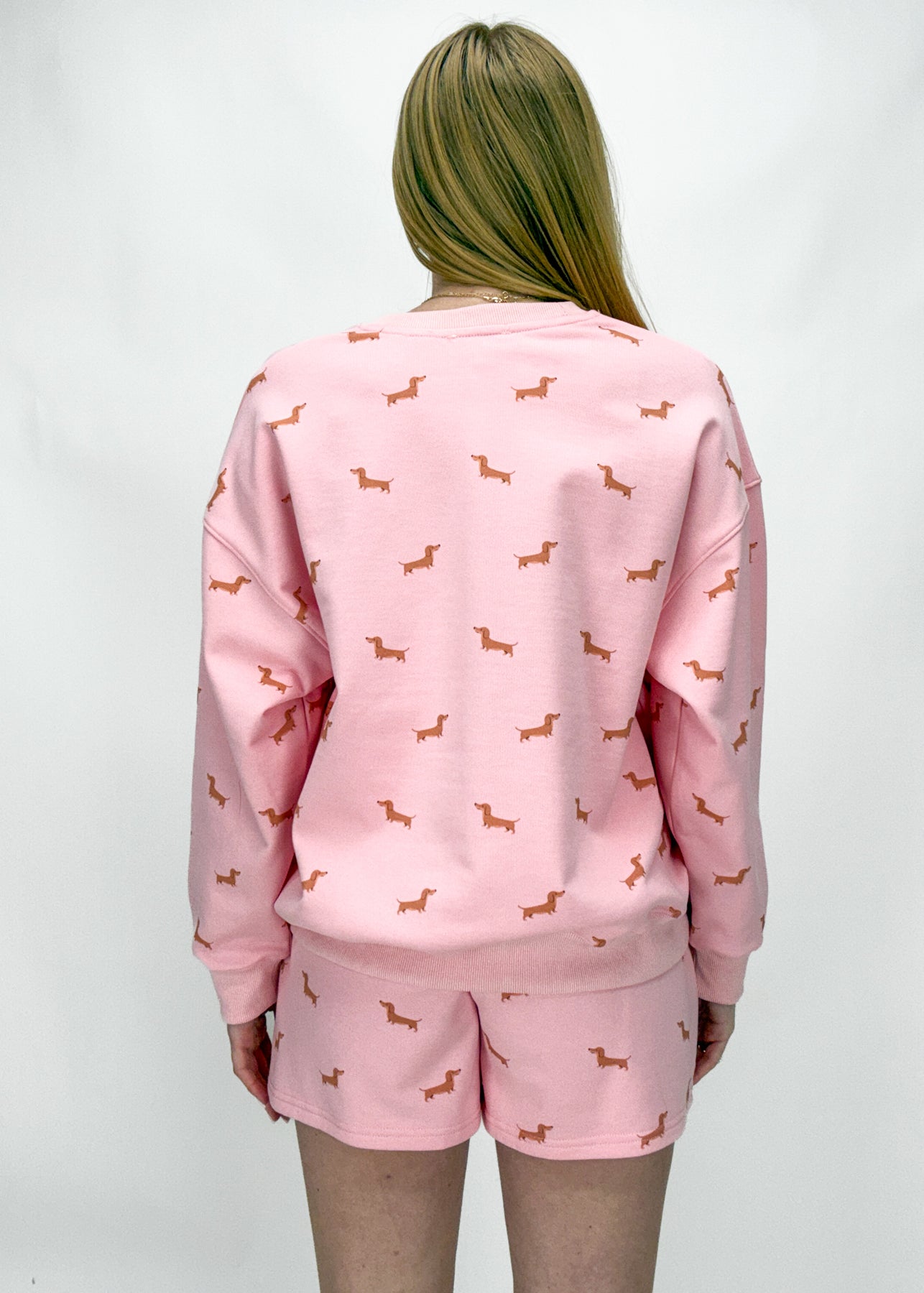 Pink + puppies = sweatshirt perfection! Covered in a mini dachshund pattern, this cozy pink sweatshirt is perfect for a day at home or a night out with the girls.