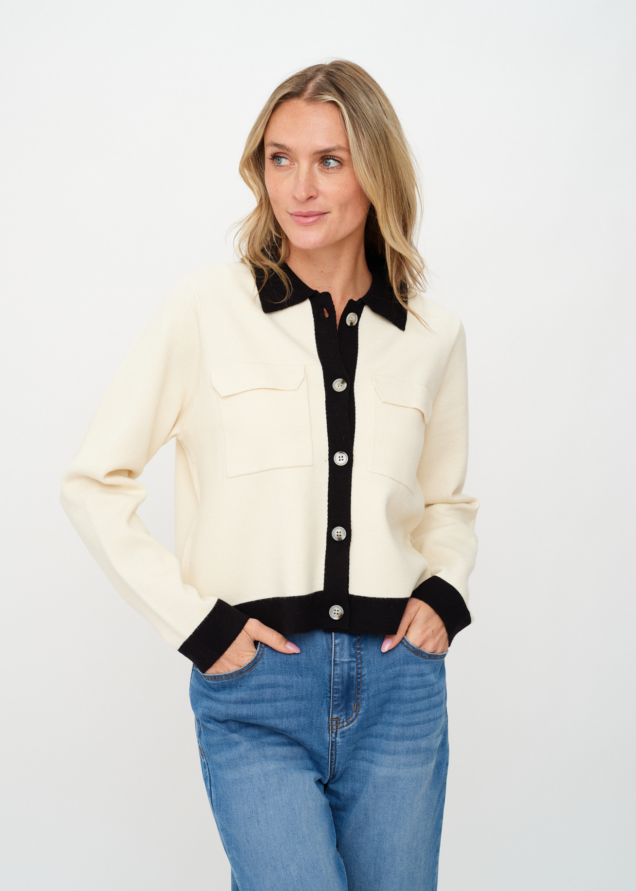 Woman wearing an ivory button up cardigan with a black underlayer and collared neckline in front of a white background
