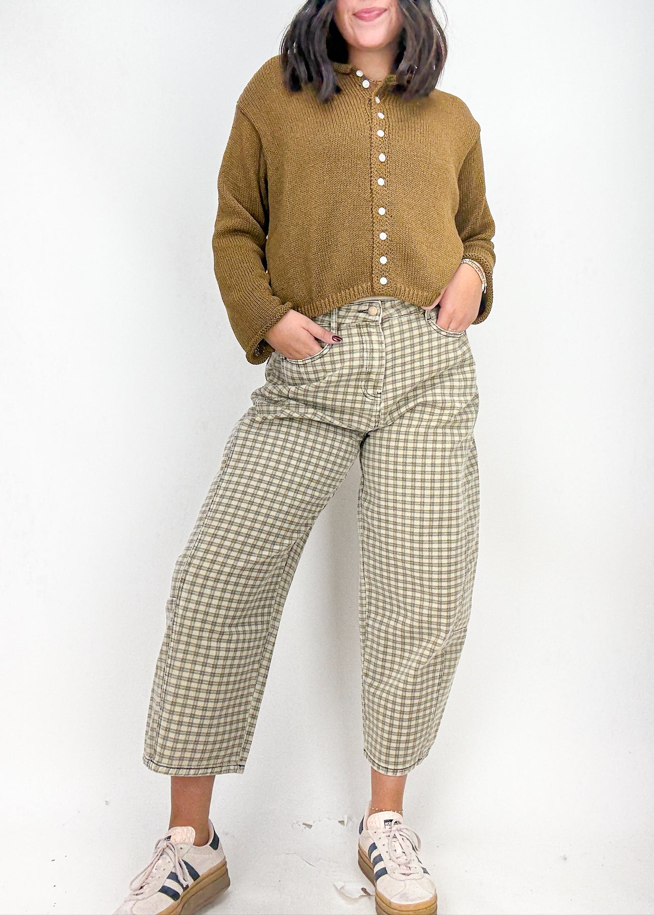 Your favorite fall pants have arrived! These brown checkered pants come in a trendy barrel style and are so fun paired with a graphic tee or a cozy sweater.