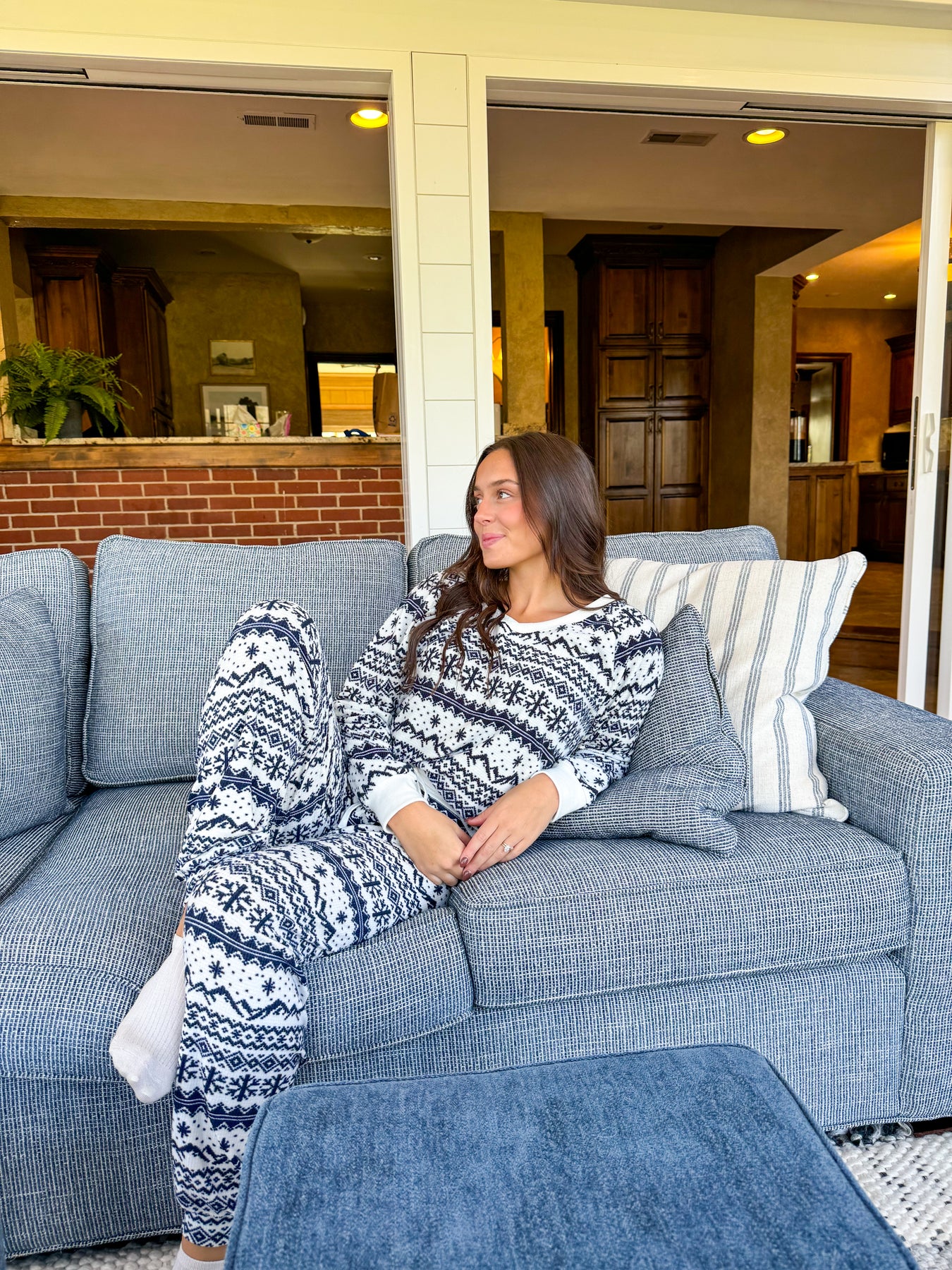 Woman wearing a blue and white fairisle patterned v-neck pajama top with matching pants in front of a tan background