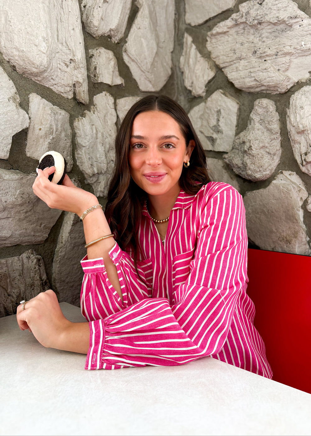 Turn heads in this bright and stunning top from Astrid Clothing. In a bold fuchsia, this piece features a striped pattern and it pairs perfectly with the Astrid Jeni Striped Shorts.