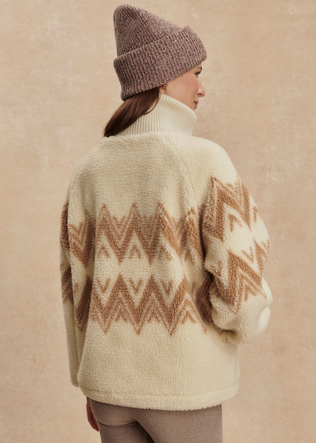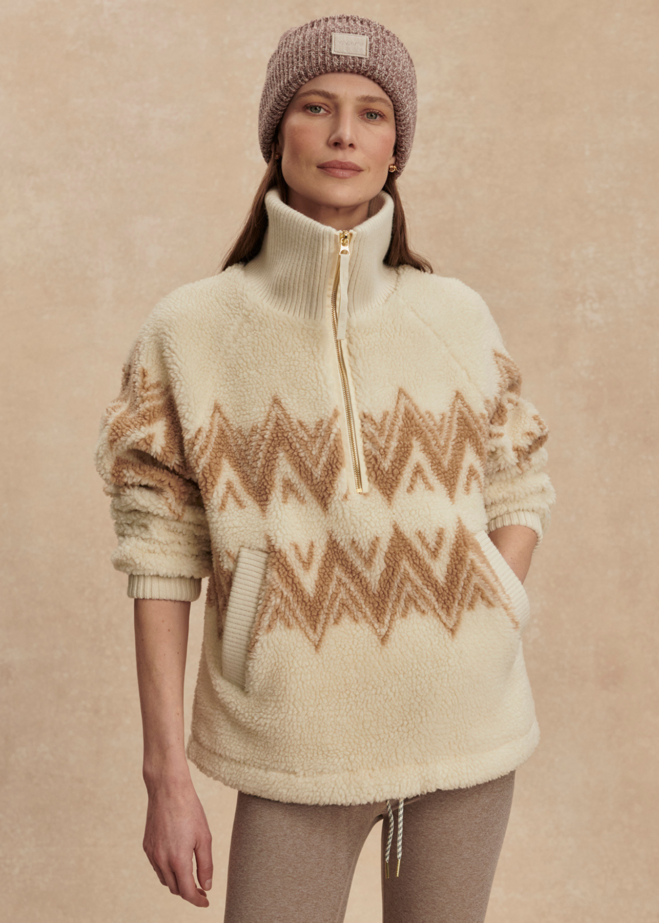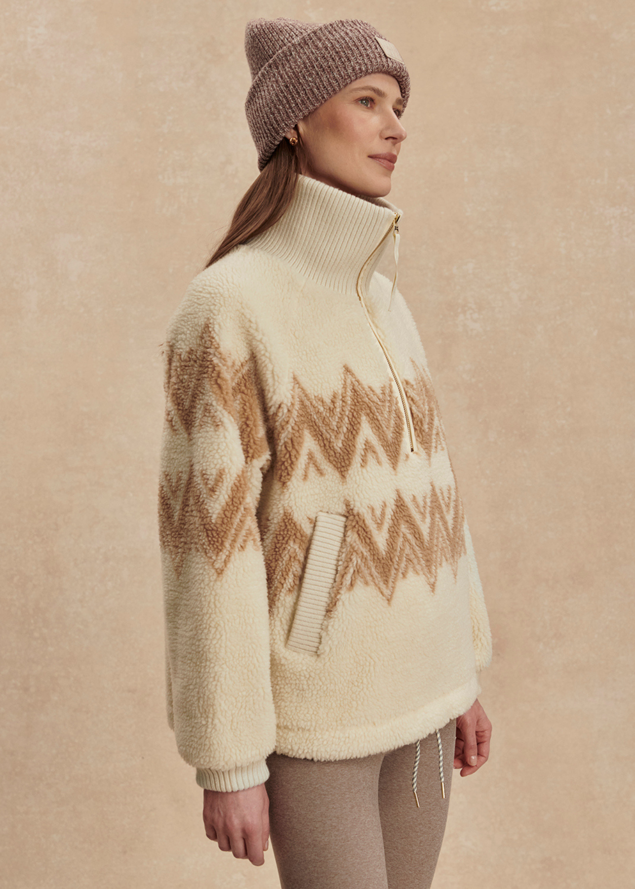 Woman turned to the side wearing a cream and brown half zip sherpa with a brown beanie and leggings