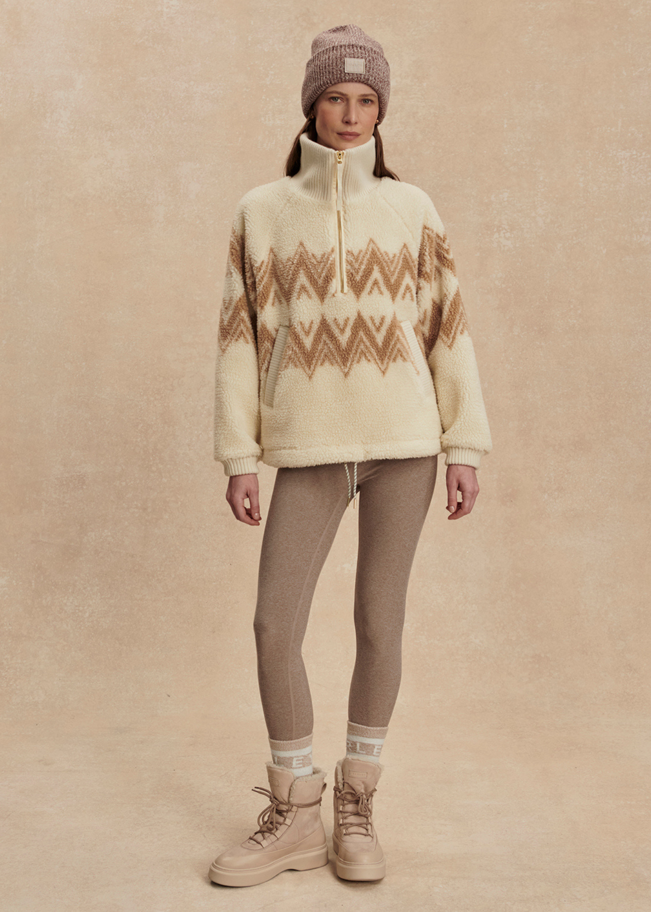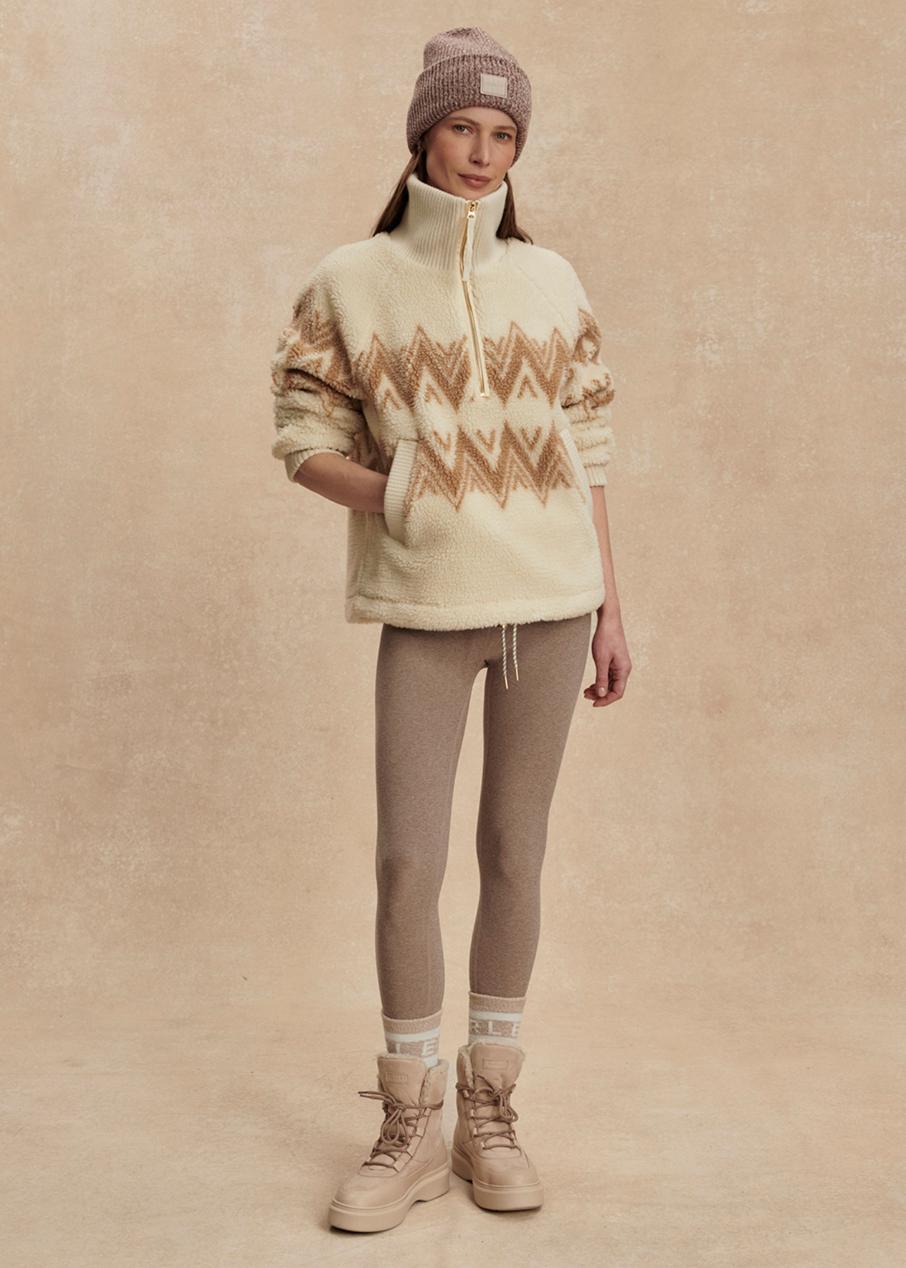 Woman wearing a cream and brown half zip sherpa with a brown beanie and leggings