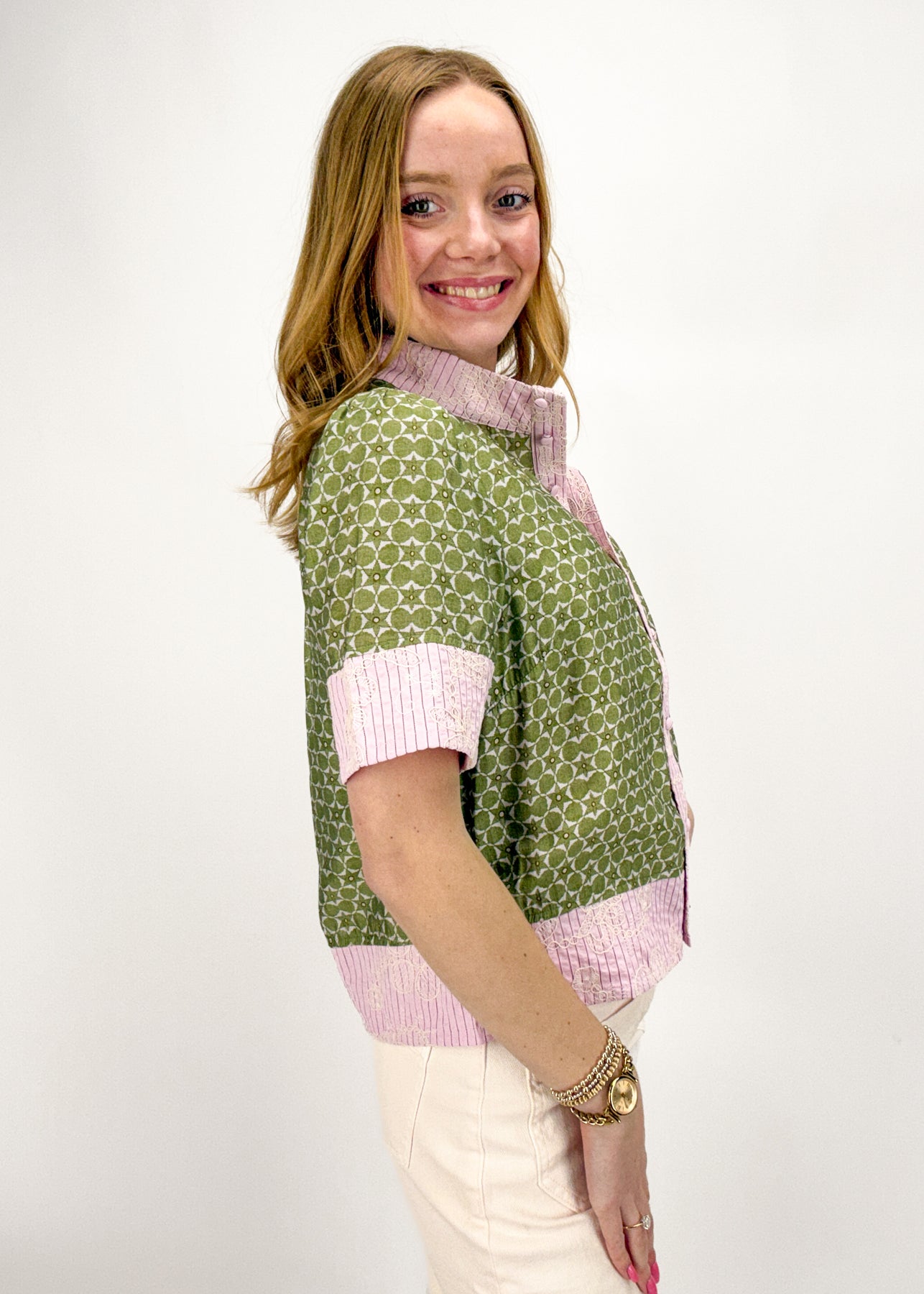 In a stunning pink and green combo, this top features a small pattern with pink striped trim and delicate embroidery.