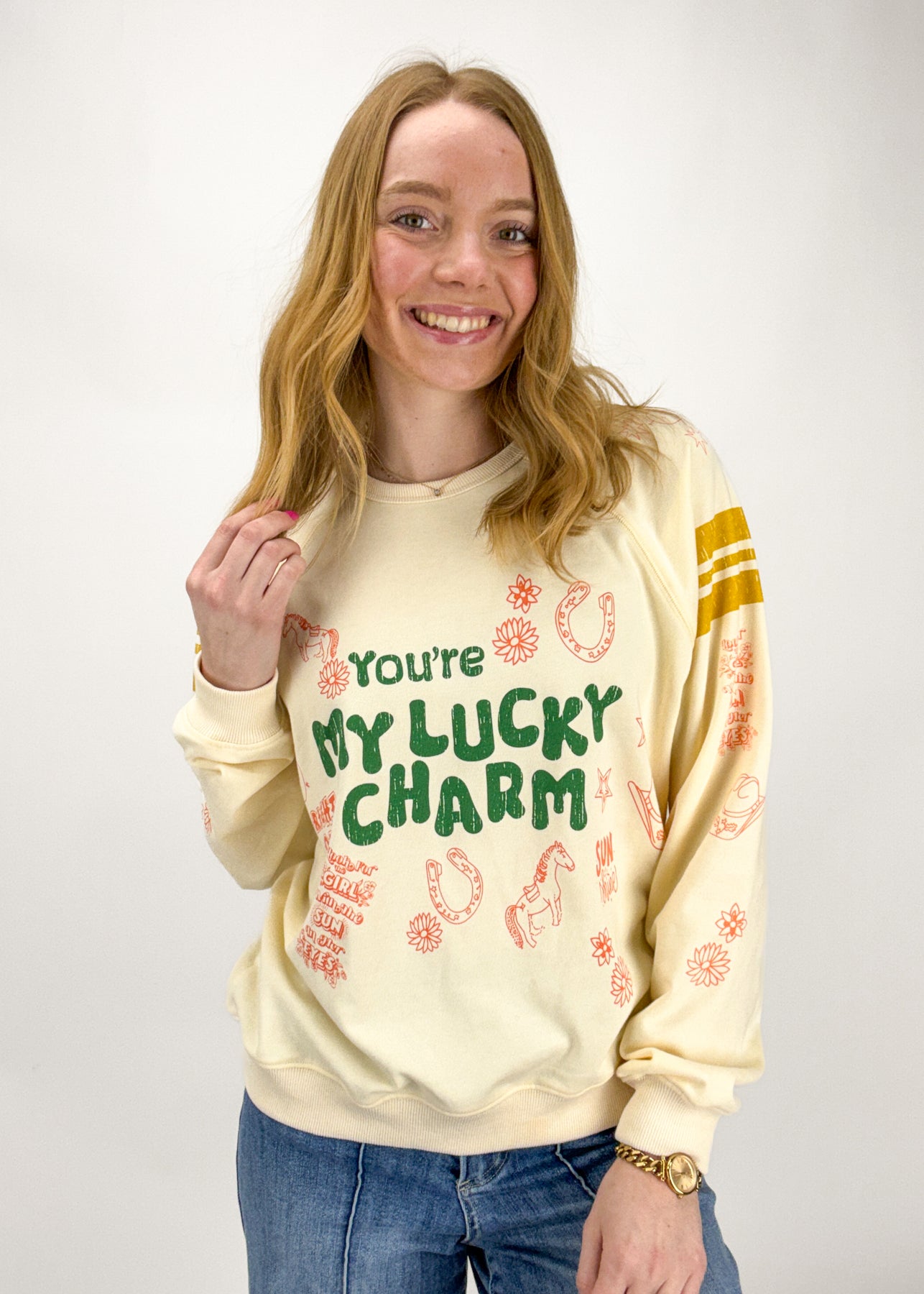 In a cozy terry knit, this cream colored sweatshirt features a "You're My Lucky Charm" graphic. This fun graphic crewneck is sure to be a fan favorite!